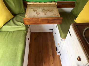 plenty of space in the van. This part was also the greatest fun as we decided to use epoxy to create our shower room. The floor is about 3l of epoxy (clear and a little bit of blue colour) covering shells and which created the look of a small sea on the floor. To create the walls we used floor panels which we’ve also covered with thin layer of epoxy to make it waterproof. The kitchen top is a seat top sitting on 2 pieces of wood