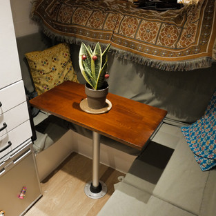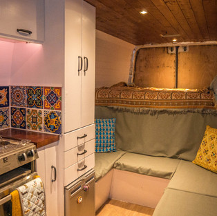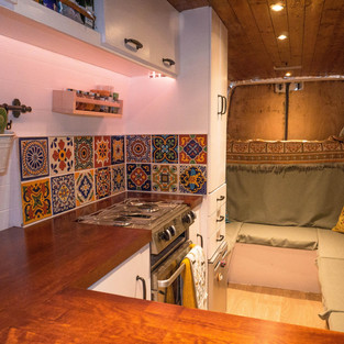 I am from Mexico and we both love the decorations, colors and styles that you find there. We've based the style of the van on these colorful features. Early on the build we bought our colorful tiles from Mexico and we had some cushions from there too. We left all of the walls, cabinets and bench white and grey to be able to put plenty of color on top.