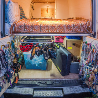 We've put a big effort on maximizing storage space without making the van feel too tight. We've left a lot of space under the bed for all of our climbing gear and some extras. We also have access to storage under the seats and behind the backrests for more frequently used things.
